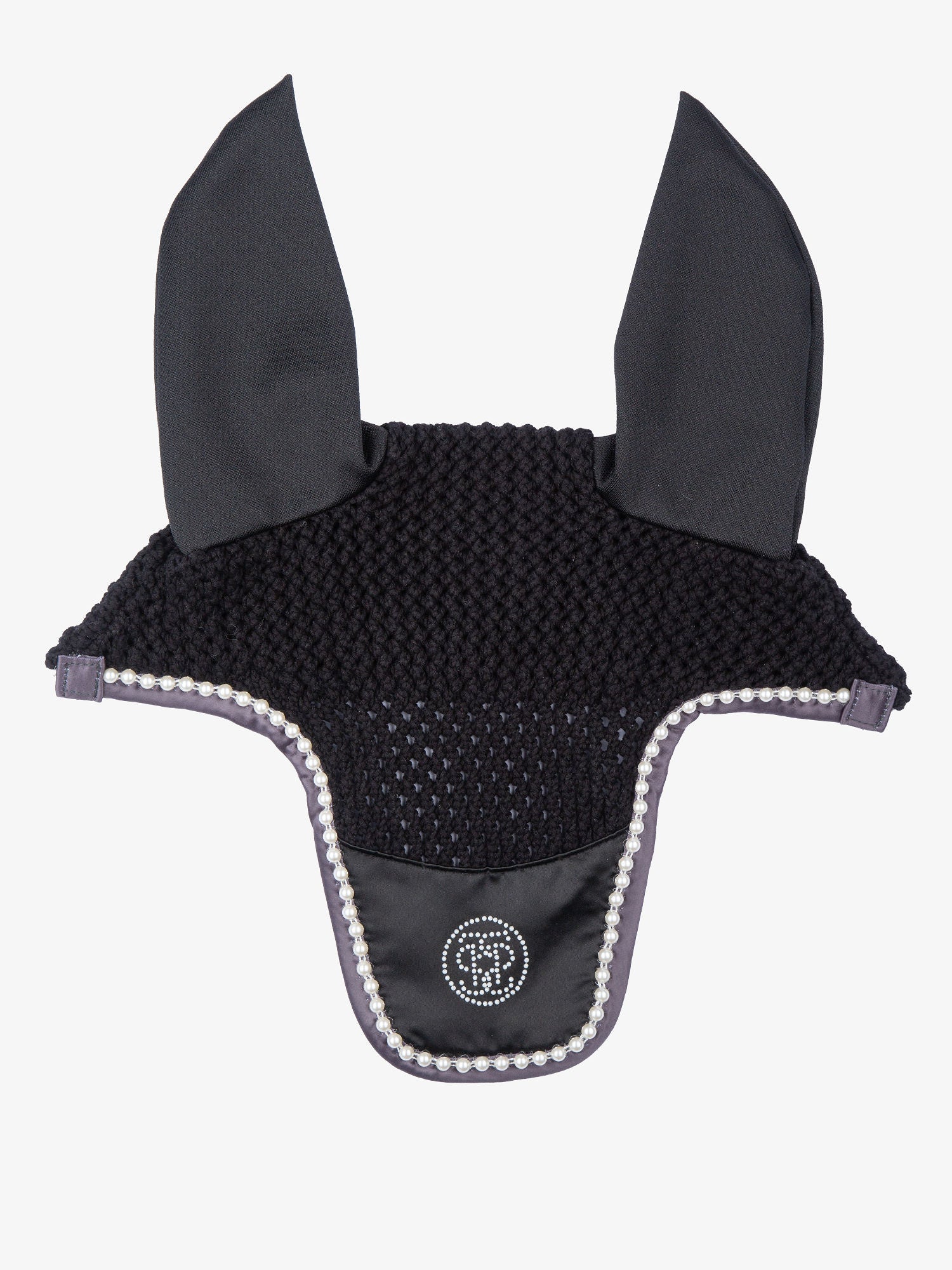 Crochet knitted ear bonnet with a Pearl Monogram logo, exclusive pearl details, and elastic ears for comfort and fit.