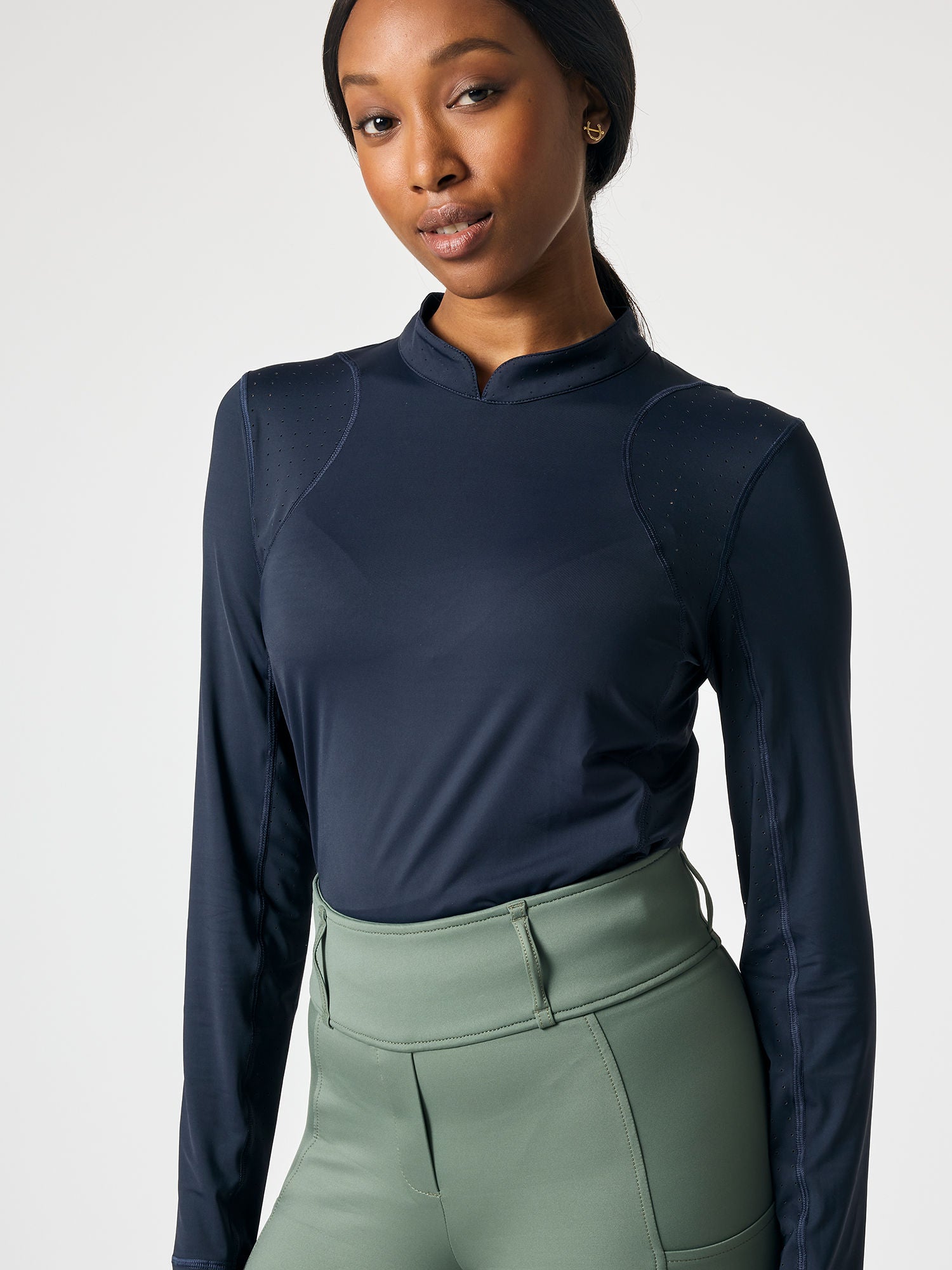 Introducing our long sleeve top, designed for comfort and breathability. This top features strategically placed breathable panels with laser cut holes to keep you cool and comfortable throughout the day. The mandarin collar with hook & eye fastening adds a touch of elegance and practicality, making it perfect for both riding and casual wear.