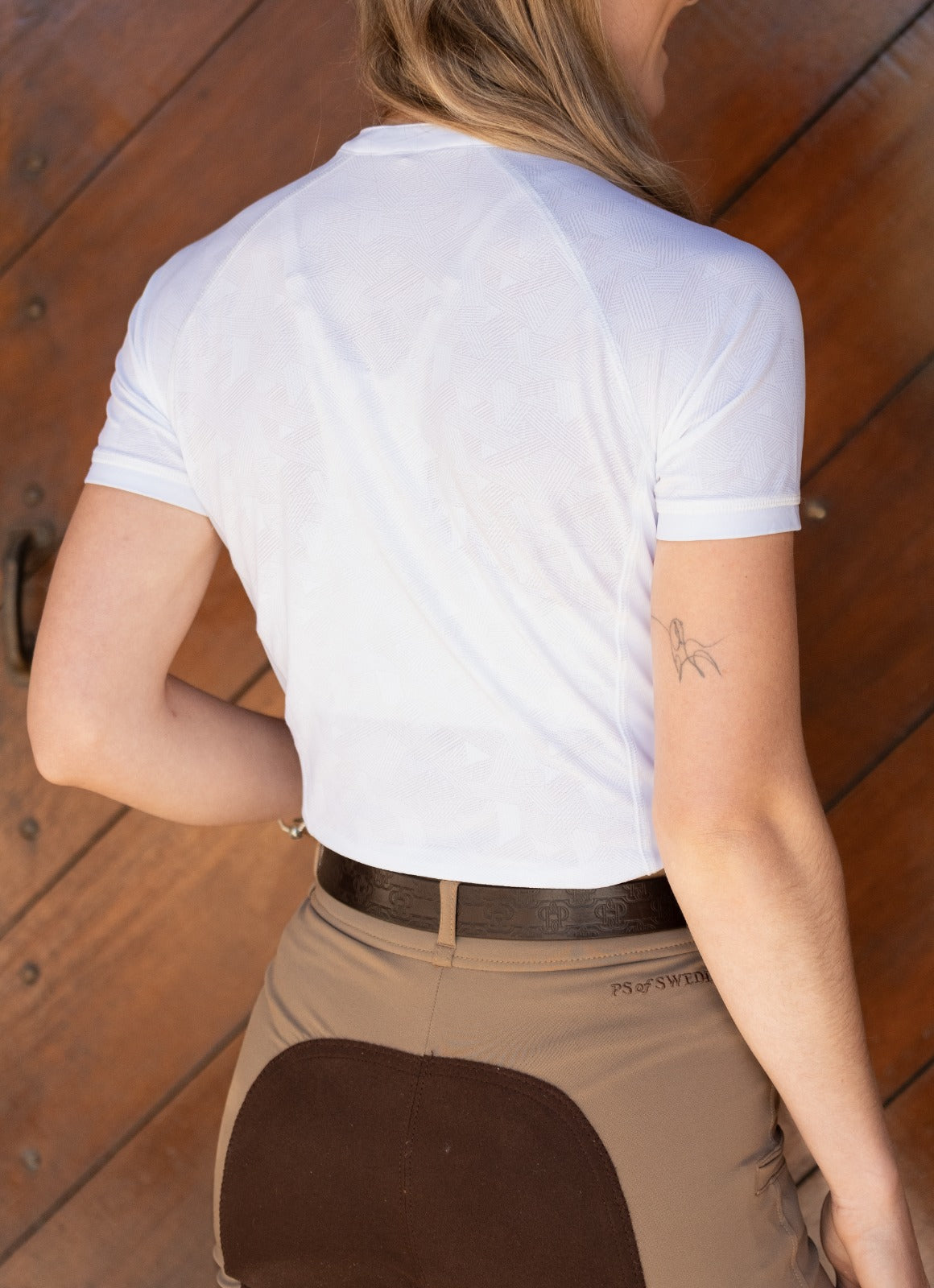 Selena Mesh Panelled Shirt, the perfect blend of style, performance, and comfort for the competitive equestrian. Designed for the modern rider, this feminine top features strategically placed mesh panels for enhanced breathability, ensuring you stay cool and comfortable during intense competitions.