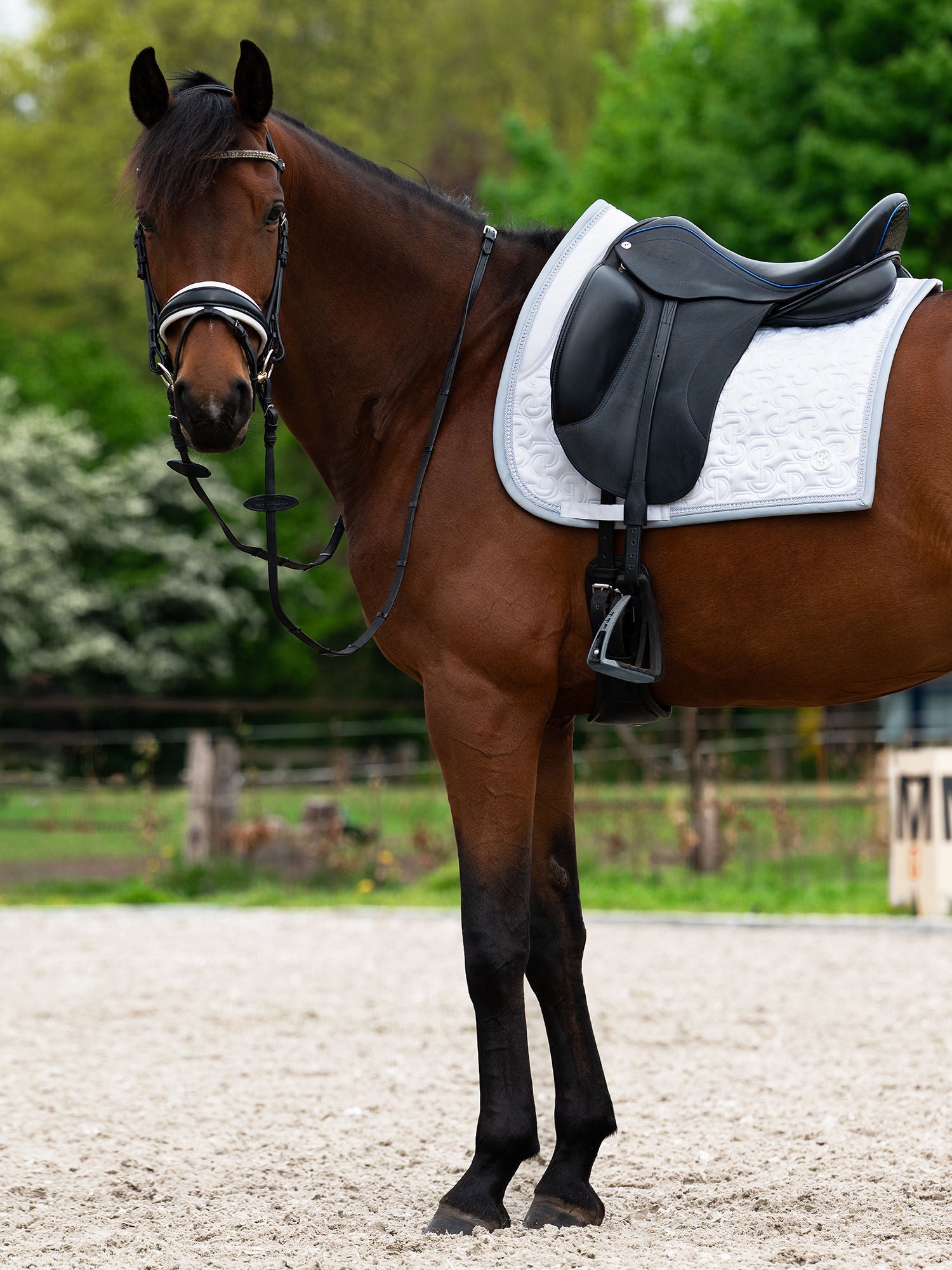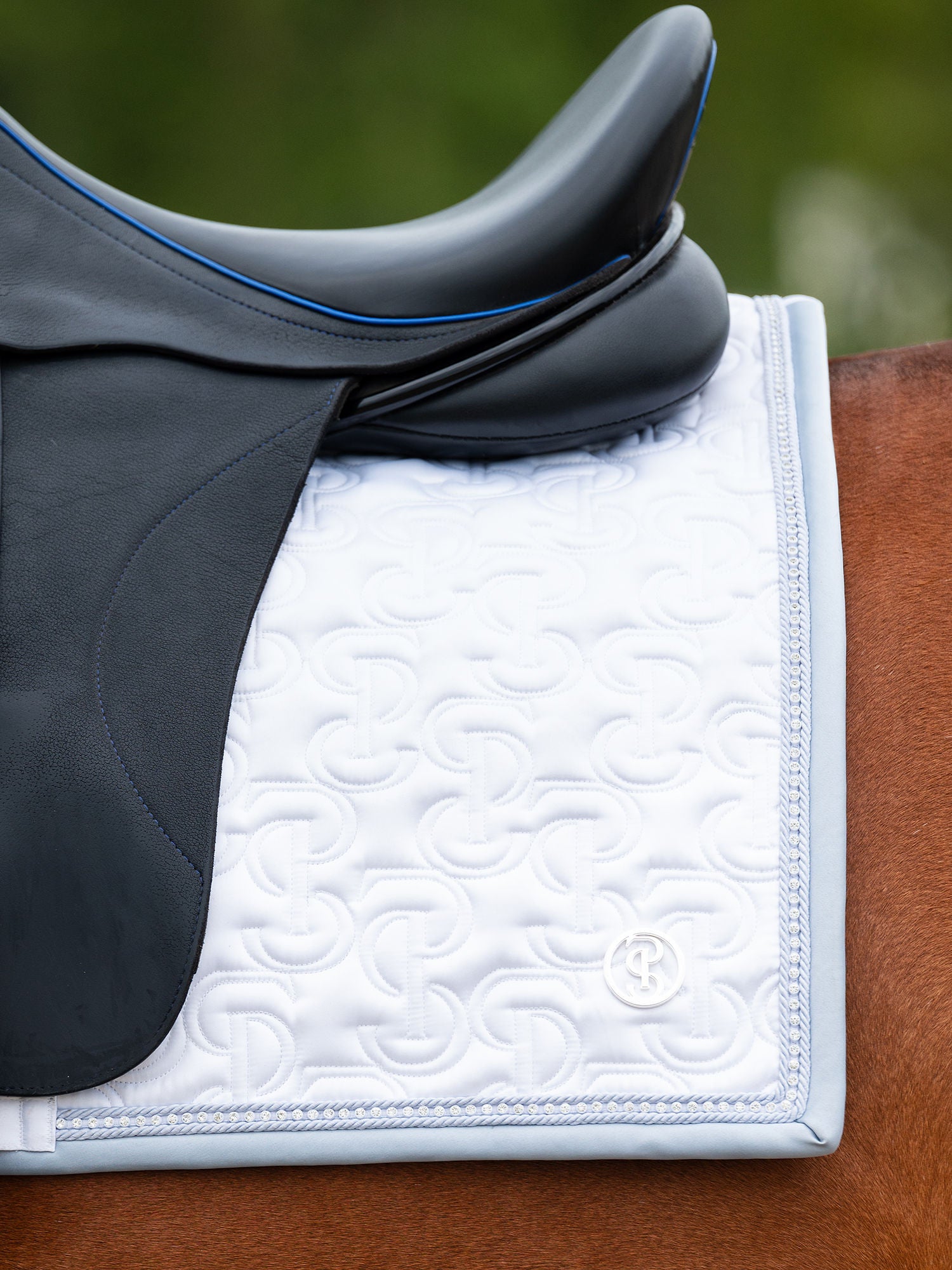 Anatomically designed saddle pad in high-quality shiny satin fabric, featuring a unique logo quilt and and crystal trimIntricate embroidered PS logo quilt
