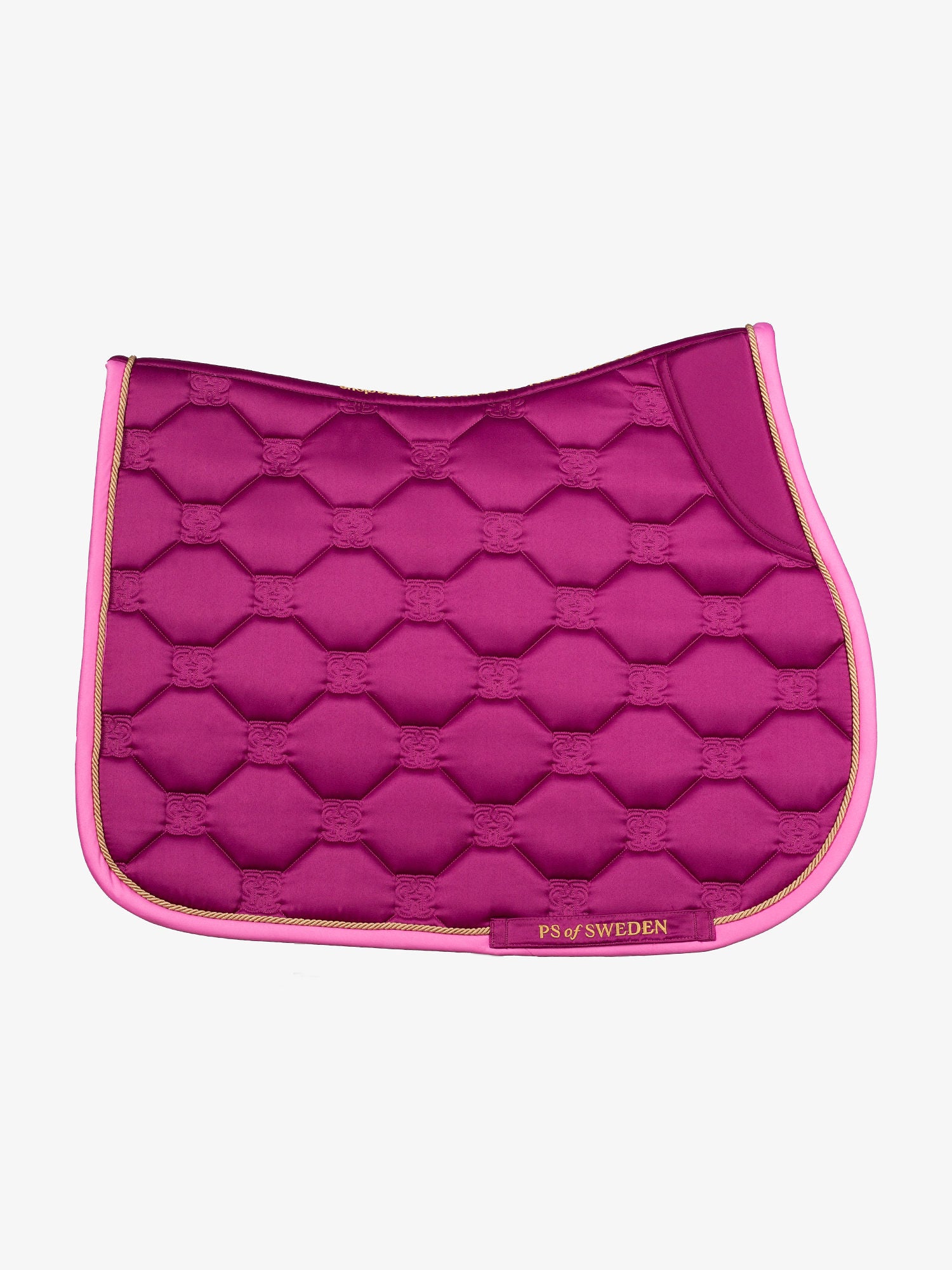 Durable satin saddle pad with medium-thick padding, intricate PS logo quilting, stop cushions, and covered girth straps. Anatomically shaped with the signature PS quote along the spine.
