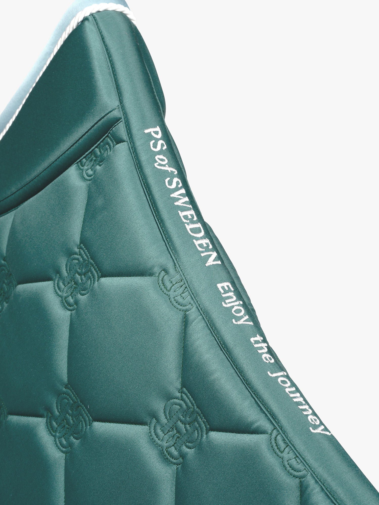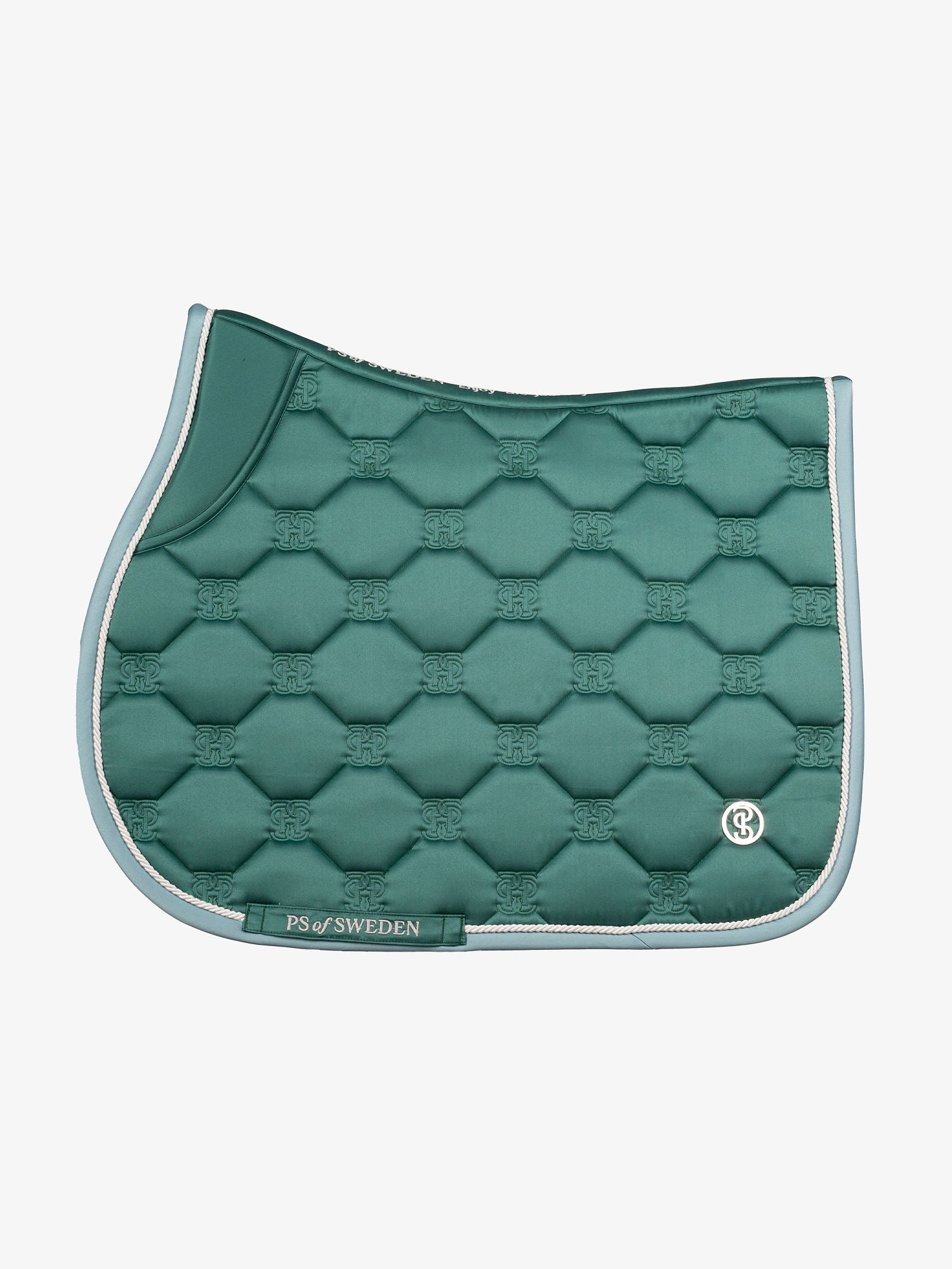 Durable satin saddle pad with medium-thick padding, intricate PS logo quilting, stop cushions, and covered girth straps. Anatomically shaped with the signature PS quote along the spine.