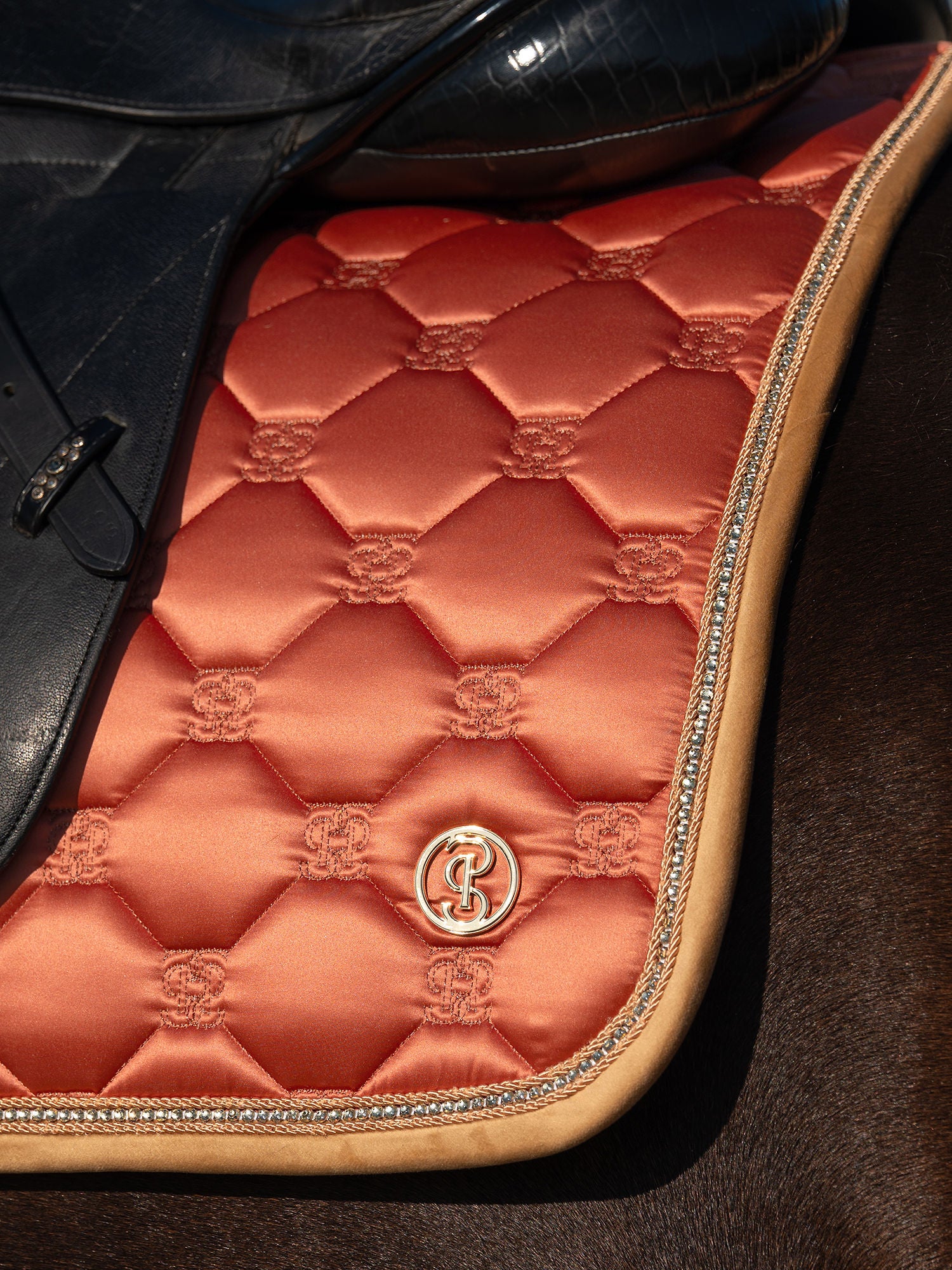Anatomically designed saddle pad composed for the horse's well-being. Made from soft satin with velvet-edged trim to prevent chafing. Features a quick-drying lining, PS Monogram quilting, and decorative piping.